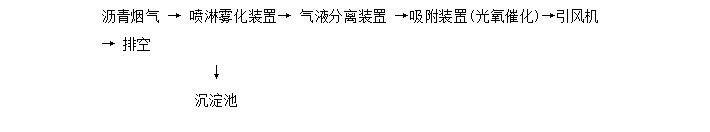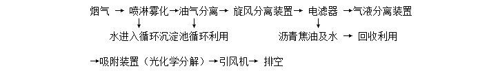 在引風(fēng)機(jī)的負(fù)壓作用下帶有粉塵物質(zhì)的瀝青煙氣經(jīng)過加裝噴淋頭的管道,經(jīng)過連續(xù)噴漆淋使煙氣中的油粒子和小粉塵等被沖洗下來、混溶于水中后流入冷卻循環(huán)水池,出來的煙氣經(jīng)油氣分離裝置去除部分油質(zhì)及水分后進(jìn)入旋風(fēng)除塵除去部分不溶于水的焦粉等粉顆粒類物質(zhì),而后進(jìn)入瀝青煙電濾器捕集掉剩余的油污及膠粉顆粒,處理后的氣體再經(jīng)過氣液分離裝置再次精細(xì)凈化,然后再進(jìn)入吸附裝置或光化學(xué)分解裝置,除掉煙氣中的瀝青異味,凈化后煙氣通過煙囪排入大氣。